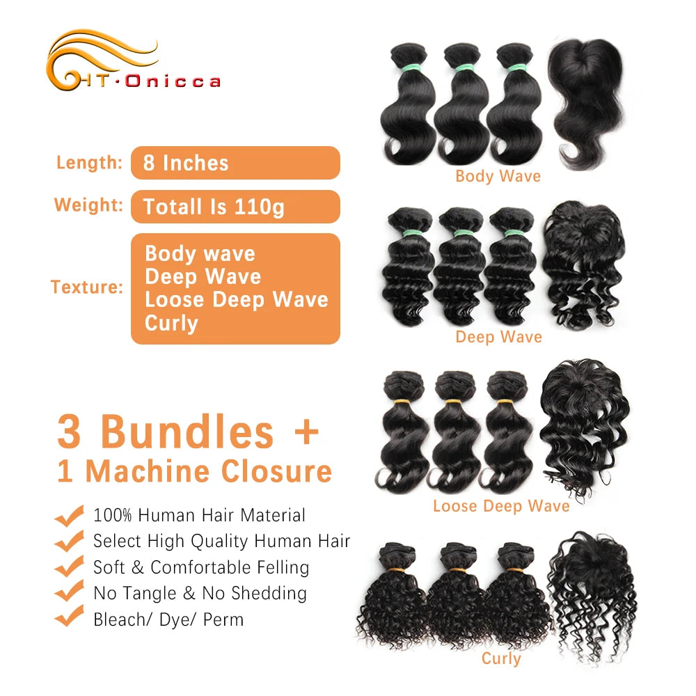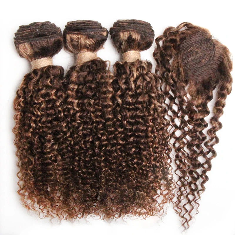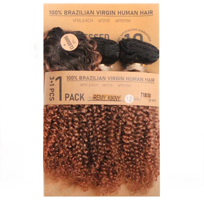 Mèches indiennes naturelles crépues et bouclées, 8 pouces, avec Closure, couleur naturelle, Extensions de cheveux, 4 pièces/lot, 110g.